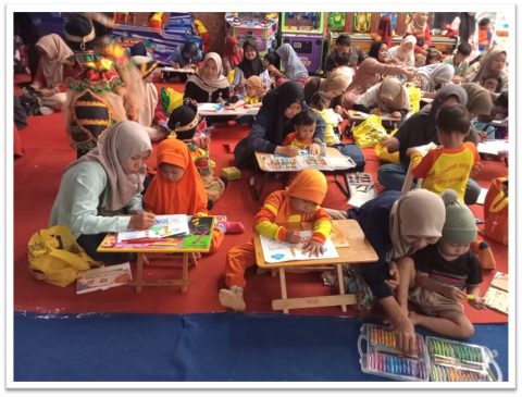 Sudah dua jam anak anak mengikuti Lomba mewarnai tapi tidak merasa lelah dan bosan karena ada hiburan badut yang menemani dan menghiburnya.